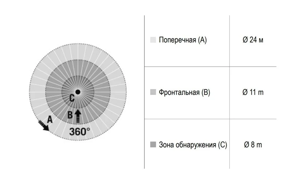 | диапазоном обнаружения Фронтально | Ø 11 м |