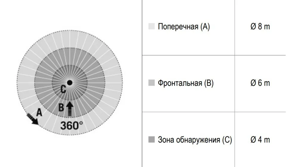 | диапазоном обнаружения Фронтально | Ø 6 м |
