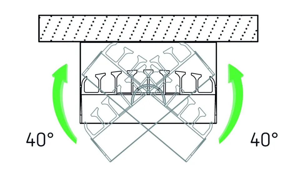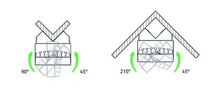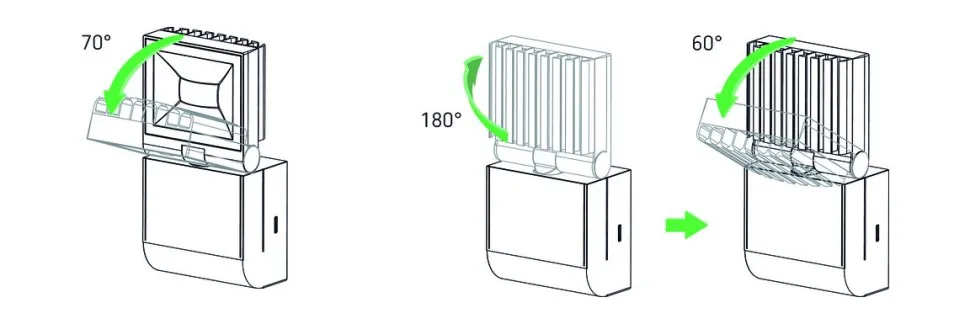 - Прожектор может быть повёрнут на ± 40° в горизонтальной плоскости; на 70° вниз; развёрнут на 180° - для освещения стены.