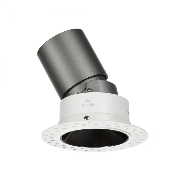 Безрамочный встраиваемый акцентный светодиодный светильник круглого сечения с функцией регулировки угла светового потока от 0° до 25° для монтажа под штукатурку.