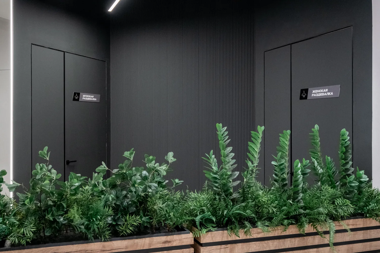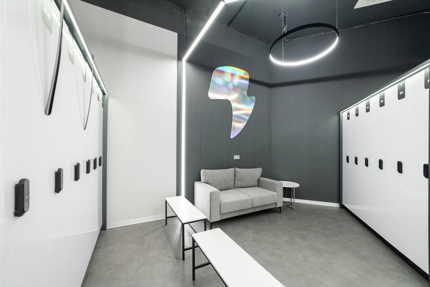 • Трековые светильники: крепятся к шинопроводу и позволяют легко перемещать светильники по потолку, что удобно для изменения направления света. Они были использованы для таких помещений как: рецепшн, зона единоборств,  тренажерный зал.