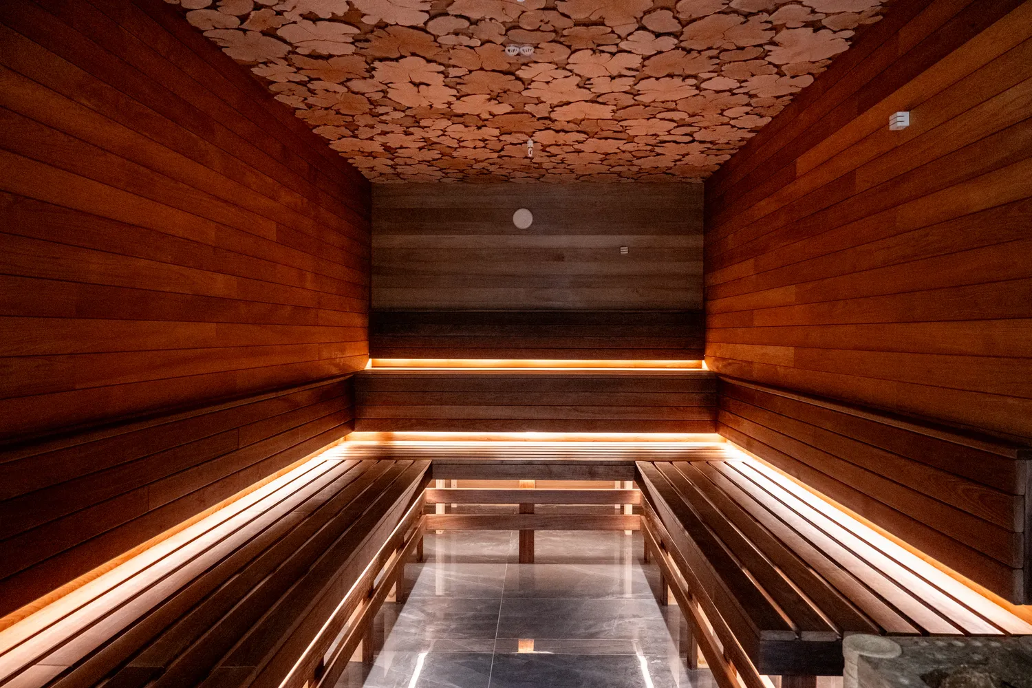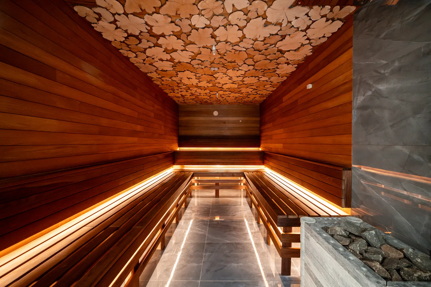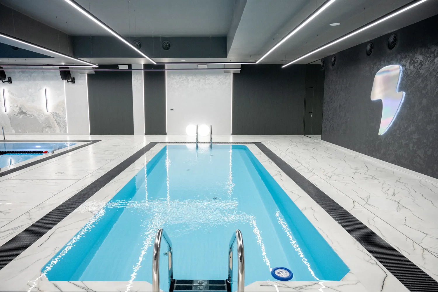 • Профильные светильники:  были выбраны в качестве основы системы освещения. Обеспечивают равномерный уровень освещенности и могут быть разной формы, цвета и мощности в зависимости от помещения. В этом проекте они присутствуют практически во всех помещениях , включая бассейн.